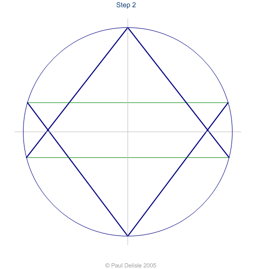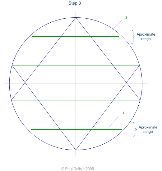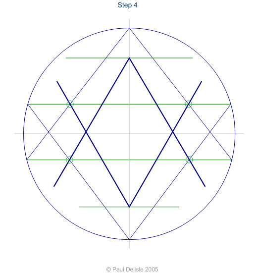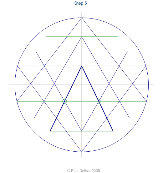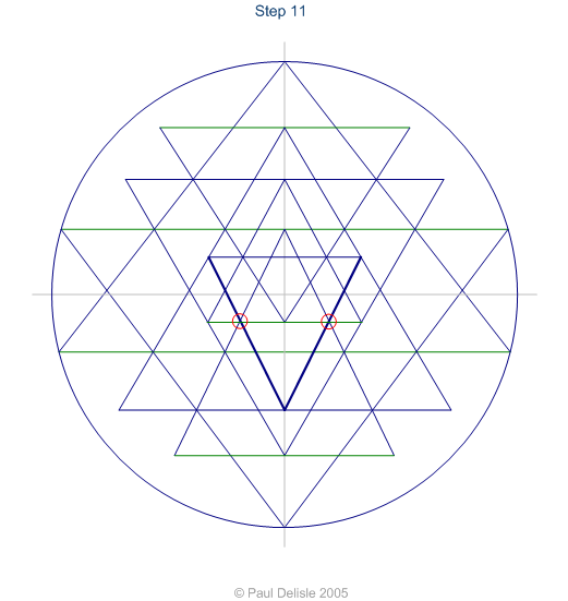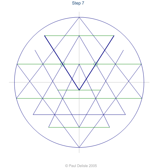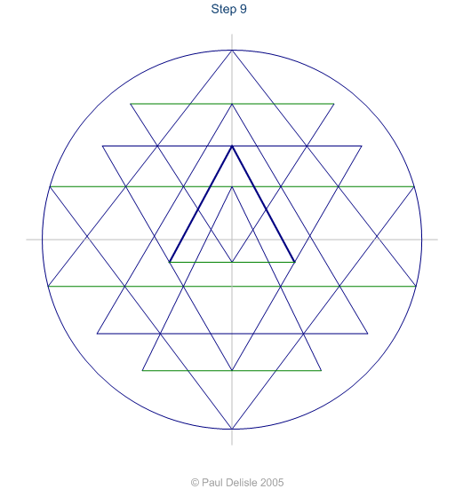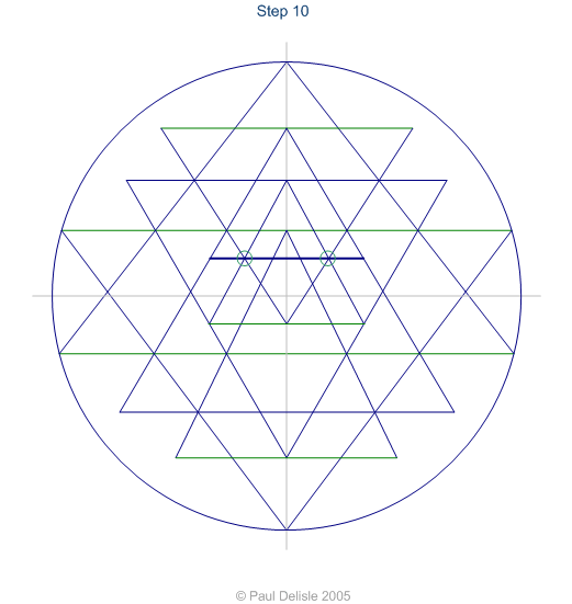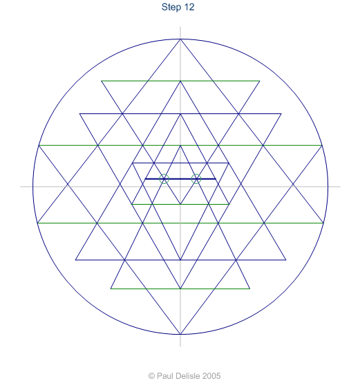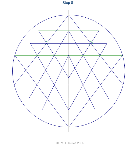 | Line 5 is the last line that is needed to finish the Sri Yantra. There is no real obvious way to know where it should go other than by trial and error. Of course this can be programmed and calculated but this is beyound the purpose of this page. In this example the 5th and last line is very close to it's ideal position so the error in the final figure is very small. If it is drawn higher or lower the error will increase proportionally. We will show later where the error shows up. |