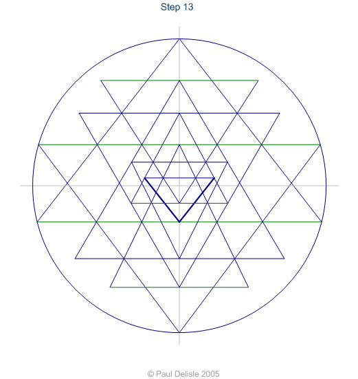 How to Draw the Sri Yantra As you have probably found out already there are a great number of methods out there to draw the Sri Yantra. Most of them are very poor and will produce a figure with mistakes at many of the triple intersections. You should know that, at least in theory it is not possible to draw a perfect Sri Yantra. There is always some little mistake even if it can't be seen on the drawing. This method ensures that there will be mistakes at only two of the nodes, which is the minimum amount of mistakes possible when drawing this figure. This method will not necessarily produce an optimal Sri Yantra. For a method to draw the optimal Sri Yantra please go here. The goal of this page is to show the proper sequence in which the lines should be drawn. The Sri Yantra geometry has five degrees of freedom. In other words you will have to decide on the placement of five lines to construct the figure. The amount of mistake in the resulting figure will depend on where you have located these five lines. If the resulting figure has a big error (two extraneous triangles) you will have to go back and change the location of some of the lines and start over. If you want to experiment with the Sri Yantra withoug having to draw it try the interactive Sri Yantra. |
