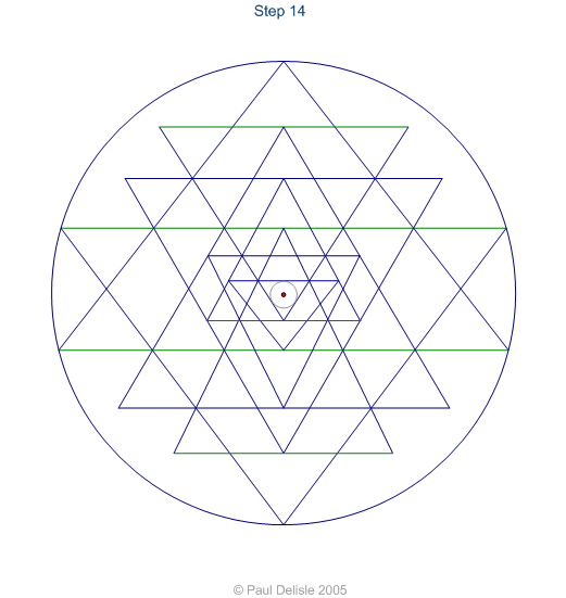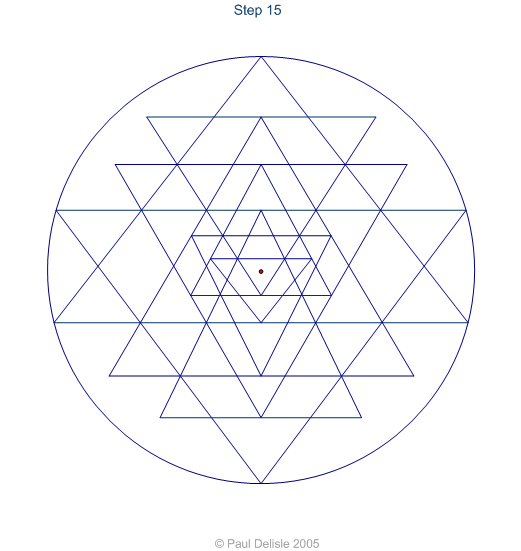 | This completes the drawing of the center part of the Sri Yantra. Not show here are the others circles with petals and the outer square enclosure. |