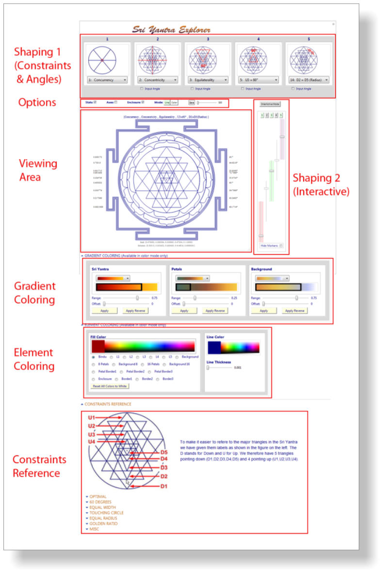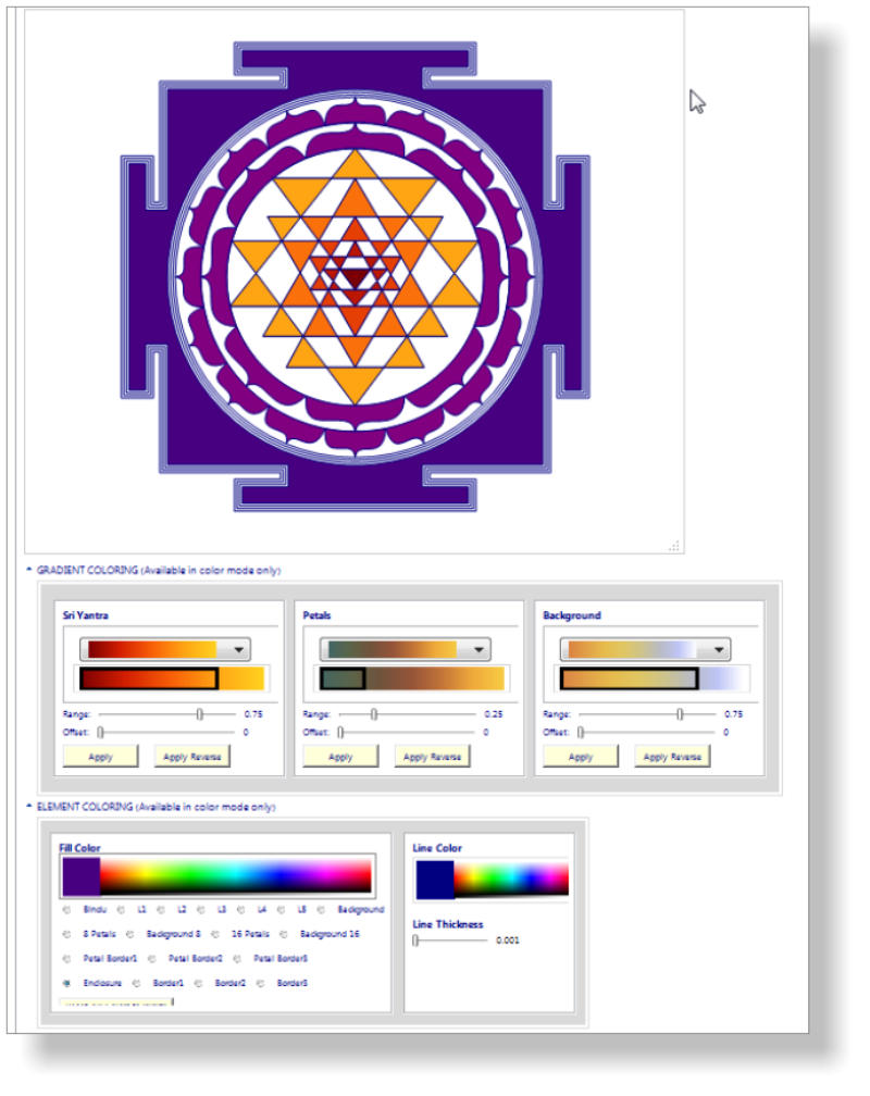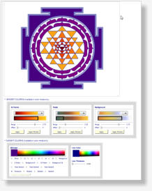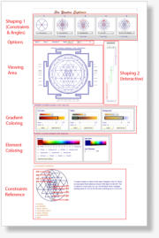 Create Your Own Sri YantrasThe Sri Yantra Explorer software is the ultimate tool to explore and create the many configurations of the Sri Yantra. You can shape the Sri Yantra by using the pre-defined constraints, custom angles, or interactively. After you are done creating you can use the coloring tools to make it look like a million.