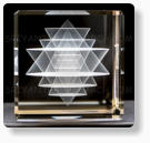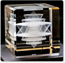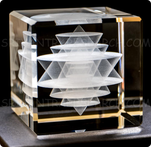 By popular demand the 3D Sri Yantra is back. Unleash the power of divine energy in your environment. This 3D Cone Sri Yantra is engraved with a laser inside a crystal glass cube. It is shipped in a beautiful gift box. For a more dramatic effect put it on a LED base (not included).Measures 3 ⅛ in (80 mm).
