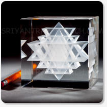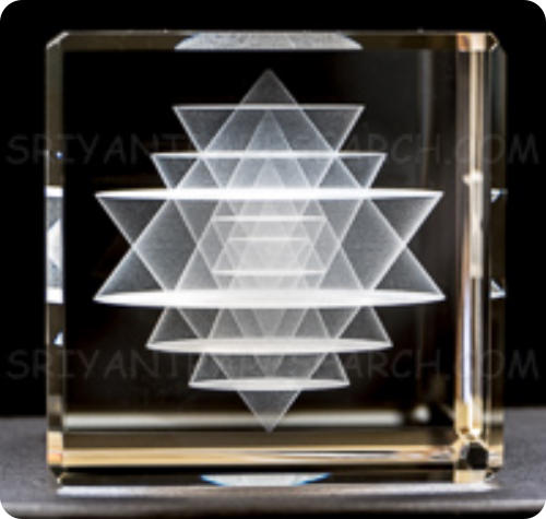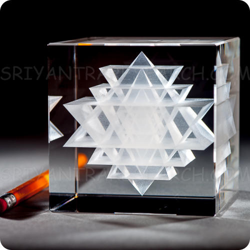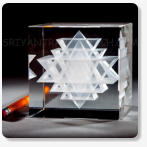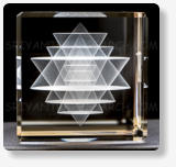 By popular demand the 3D Sri Yantra is back. Unleash the power of divine energy in your environment. This 3D Four sided pyramid Sri Yantra is engraved with a laser inside a crystal glass cube. It is shipped in a beautiful gift box. For a more dramatic effect put it on a LED base (not included).Measures 3 ⅛ in (80 mm).